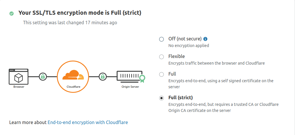 Ahora, vaya a la sección SSL/TLS del panel de control de Cloudflare , navegue hasta la pestaña Descripción general y cambie el modo de cifrado SSL/TLS a Completo (estricto) . Esto le indica a Cloudflare que siempre debe cifrar la conexión entre Cloudflare y su servidor Nginx de origen.