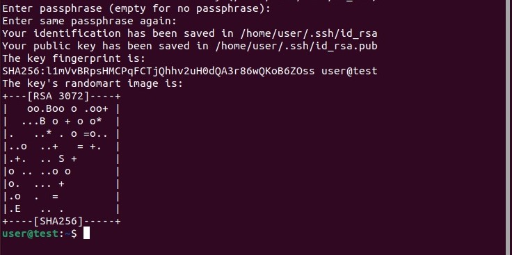 OutputYour identification has been saved in /your_home/.ssh/id_rsaYour public key has been saved in /your_home/.ssh/id_rsa.pubThe key fingerprint is:SHA256:/hk7MJ5n5aiqdfTVUZr+2Qt+qCiS7BIm5Iv0dxrc3ks user@hostThe key's randomart image is:+---[RSA 3072]----+| .|| + || + || . o . ||o S . o || + o. .oo. .. .o||o = oooooEo+ ...o||.. o *o+=.*+o....|| =+=ooB=o.... |+----[SHA256]-----+