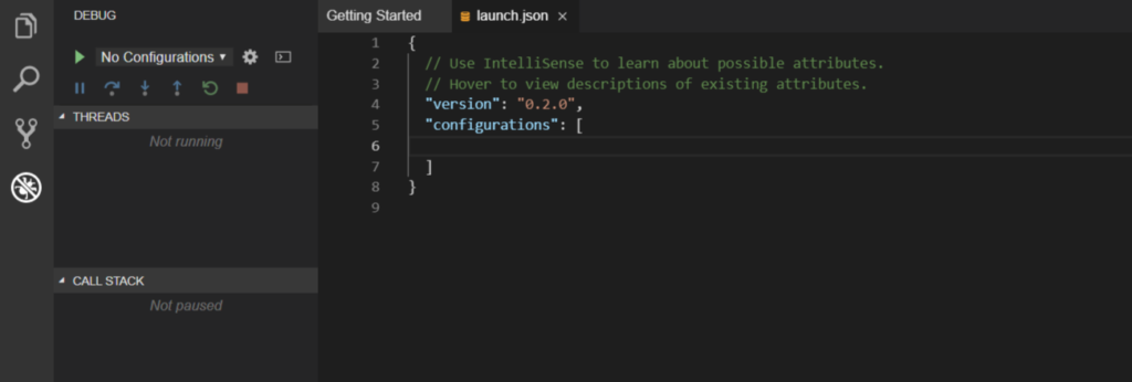 La vista final es la opción de depuración, que ofrece todas las acciones habituales para la depuración en el panel. Puede guardar las configuraciones de depuración en el launch.json