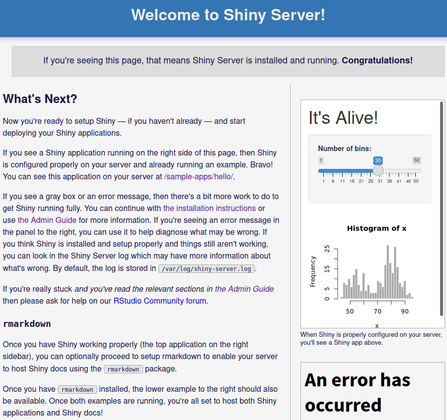 Antes de instalar Shiny Server, debe instalar el paquete Shiny R, que proporciona el marco para ejecutar aplicaciones web Shiny. Si bien puede instalar paquetes R directamente desde R o la línea de comandos, se recomienda este último método para garantizar que los paquetes se instalen para todos los usuarios y no solo para el usuario que actualmente ejecuta R.