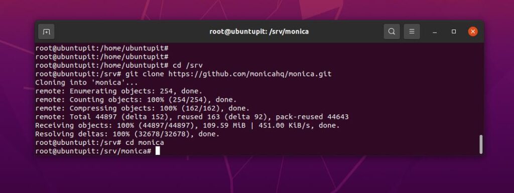 Después de ejecutar este comando, tienes un clon del repositorio oficial de Monica en /var/www/monica