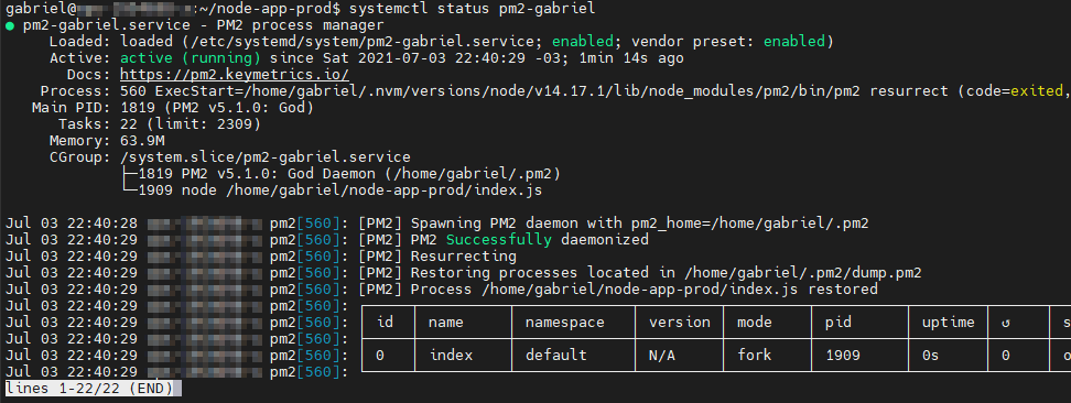 Ahora ha creado una unidad systemd que se ejecuta pm2para su usuario durante el arranque. Esta pm2instancia, a su vez, ejecuta hello.js.