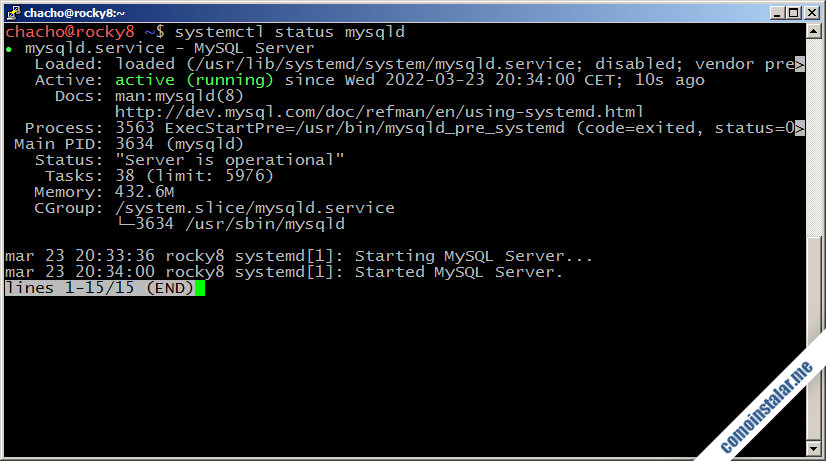 Output● mysqld.service - MySQL 8.0 database server Loaded: loaded (/usr/lib/systemd/system/mysqld.service; enabled; vendor preset: disabled) Active: active (running) since Thu 2020-03-12 14:07:41 UTC; 1min 7s ago Main PID: 15723 (mysqld) Status: "Server is operational" Tasks: 38 (limit: 5056) Memory: 474.2M CGroup: /system.slice/mysqld.service └─15723 /usr/libexec/mysqld --basedir=/usrMar 12 14:07:32 rocky8-mysql systemd[1]: Starting MySQL 8.0 database server...Mar 12 14:07:32 rocky8-mysql mysql-prepare-db-dir[15639]: Initializing MySQL databaseMar 12 14:07:41 rocky8-mysql systemd[1]: Started MySQL 8.0 database server.