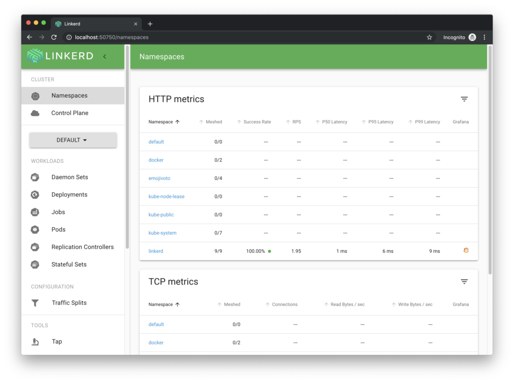 Por último, ejecute este comando para abrir el panel de control integrado de Linkerd en su navegador (recuerde que deberá proporcionar el --address 0.0.0.0indicador si no lo está ejecutando desde su máquina local):