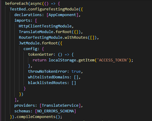 import { TestBed, waitForAsync, ComponentFixture } from '@angular/core/testing';import { By } from '@angular/platform-browser';import { DebugElement } from '@angular/core';import { AppComponent } from './app.component';import { IncrementDecrementService } from './increment-decrement.service';describe('AppComponent', () = {  let fixture: ComponentFixtureAppComponent;  let debugElement: DebugElement;  let incrementDecrementService: IncrementDecrementService;  let minimumOrMaximumSpy: any;  beforeEach(waitForAsync(() = {    TestBed.configureTestingModule({      declarations: [        AppComponent      ],      providers: [ IncrementDecrementService ]    }).compileComponents();    fixture = TestBed.createComponent(AppComponent);    debugElement = fixture.debugElement;    incrementDecrementService = debugElement.injector.get(IncrementDecrementService);    minimumOrMaximumSpy = spyOn(incrementDecrementService, 'minimumOrMaximumReached').and.returnValue(true);  }));  it(`should show 'Limit reached' message`, () = {    fixture.detectChanges();    const message = debugElement.query(By.css('p.message')).nativeElement.innerText;    expect(message).toEqual('Limit reached!');  });});