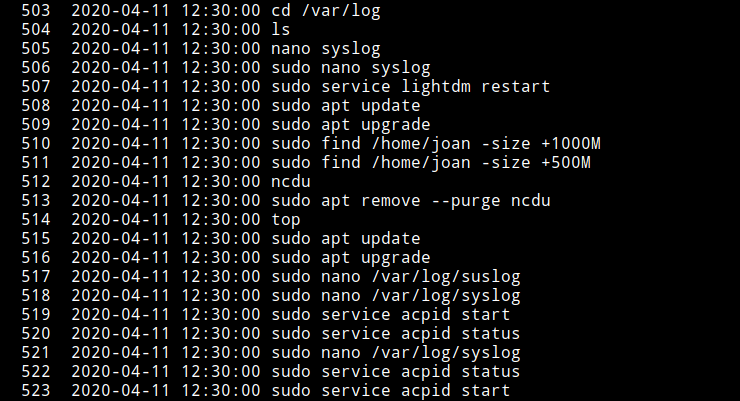 comando. Esto imprimirá nuestros comandos recientes, un comando por línea. Esto debería mostrar, como máximo, la cantidad de líneas que seleccionaste para la HISTSIZE