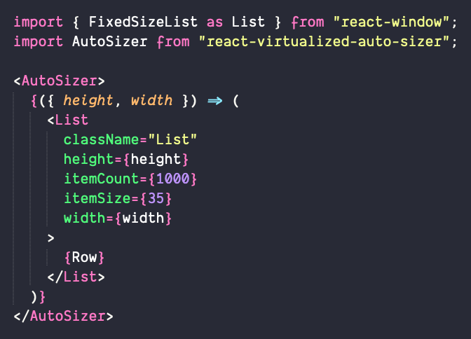 AutoSizer {({ height, width }) = ( List className="List" height={height} itemCount={1000} itemSize={150} width={width} itemData={moviesList} {Row} /List )}/AutoSizer
